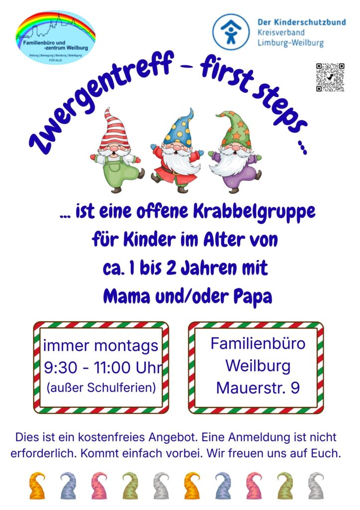Seit 05. Januar findet unser DropIn – Willkommenstreff für Eltern mit Kleinkindern nach einer kurzen Winterpause wieder statt. Die kostenfreien wöchentlichen Treffen freitags von 9.00 – 11.30 Uhr in den Räumen des „Treffpunktes Weilburg“, Schwanengasse 3 laufen ganzjährig und sind allen Familien mit Kindern im Kleinkindalter offen. Auch Eltern mit älteren Kindern sind natürlich herzlich Willkommen!